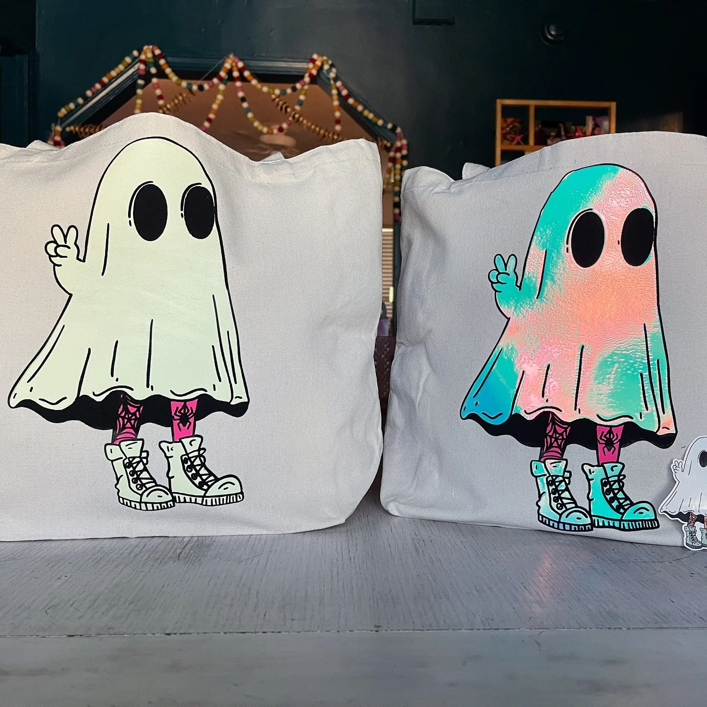 View fullsize Super excited about how these totes came out, but I do have to give G the credit for suggesting I do the glow in the dark version too. Plus some cute stickers. She requested the capyBOOra.
