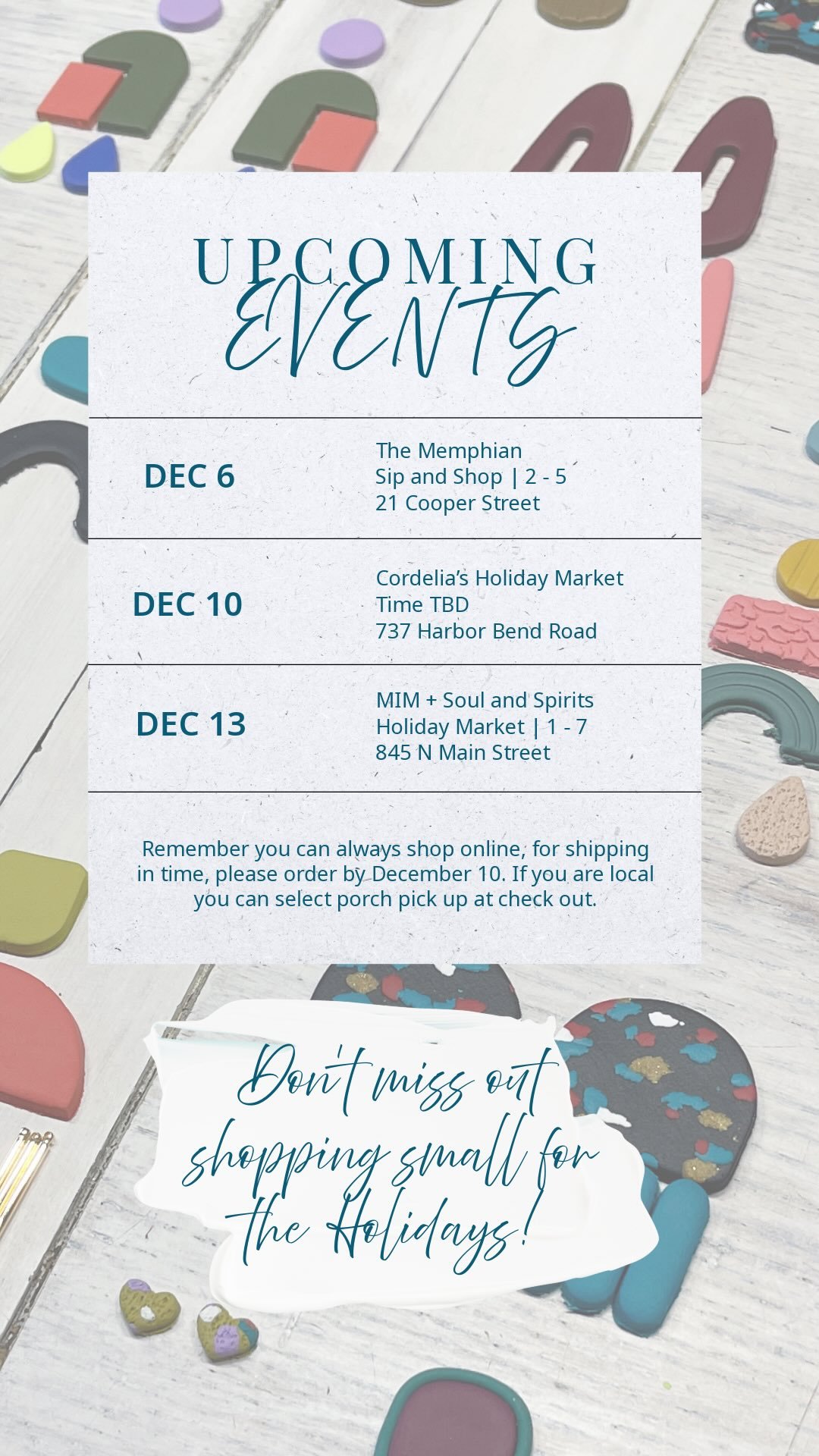 View fullsize Check out my list of upcoming markets, plus swipe through to see my mini collection I’m dropping for the @uofmemphis Holiday Market this Sunday from 11-5. A portion of my sales will be donated to the University Schools arts program.